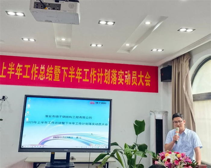 7月15日,淮安市揚子鋼結(jié)構(gòu)工程有限公司(以下簡稱“揚子鋼構(gòu)”)召開了2023年上半年工作總結(jié)暨下半年工作計劃落實動員大會。公司全體管理人員參加了會議,會議由人資行政部張偉主持。